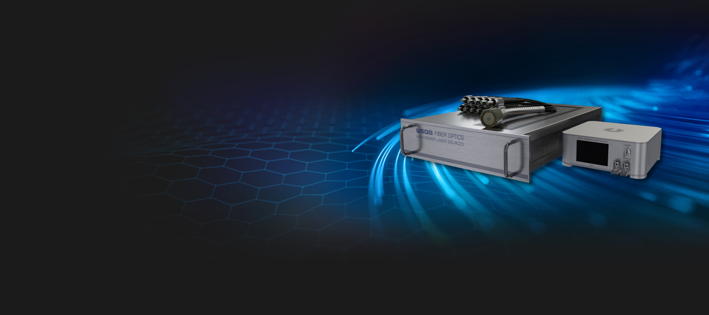 Laserové systémy, napájecí laserové zdroje a optické kabely pro přenos laserového paprsku.